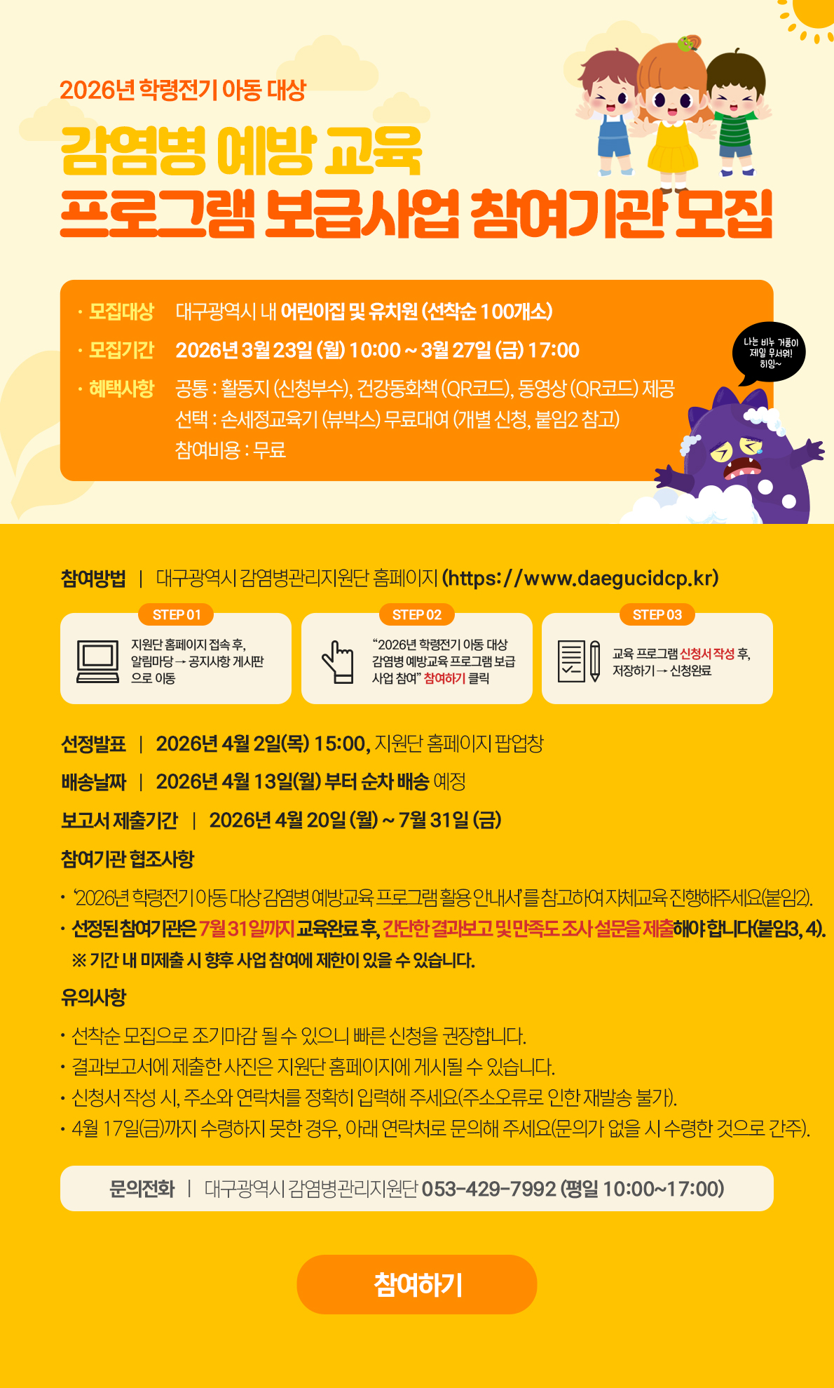 | [마감] 2026년 학령전기 아동 대상 감염병 예방 교육 프로그램 보급사업 참여기관 모집(어린이집 및 유치원) 2026.03.16 |